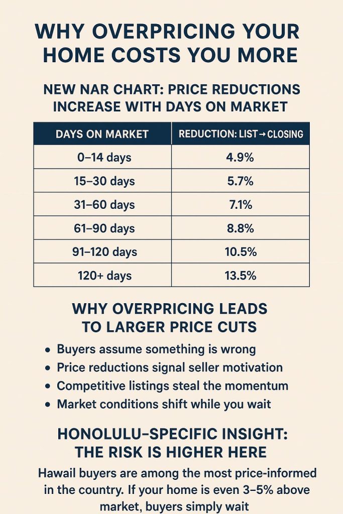 Lawrence Yun, PhD, explains that homes sitting on the market longer tend to face much steeper price cuts. In Honolulu, this pattern seems even stronger because buyers are well-informed and quick to react when a listing seems overpriced.